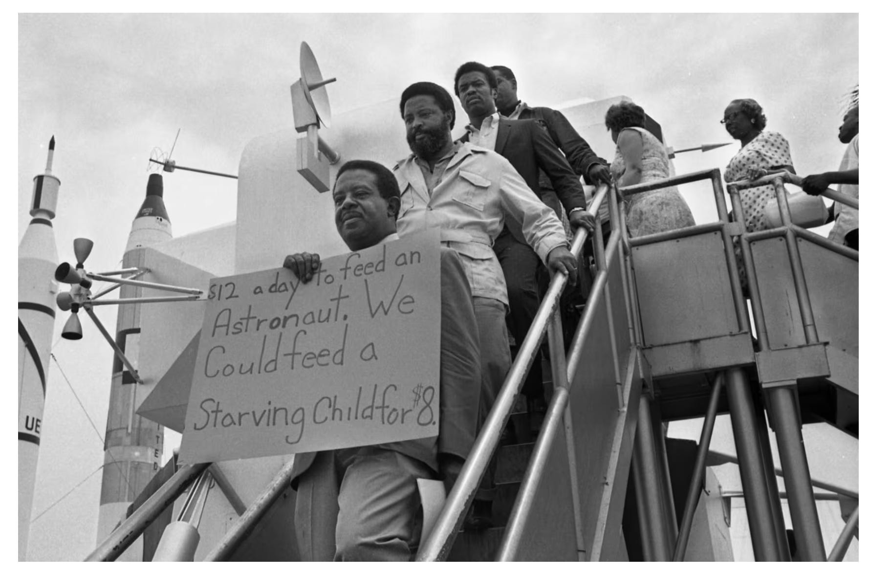 A group of 500 mostly African American protesters led by civil rights leader Ralph Abernathy arrived outside the gates of the Kennedy Space Center a few days before the launch. They brought with them two mules and a wooden wagon to illustrate the contrast between the gleaming white Saturn V rocket and families who couldn’t afford food or a decent place to live.