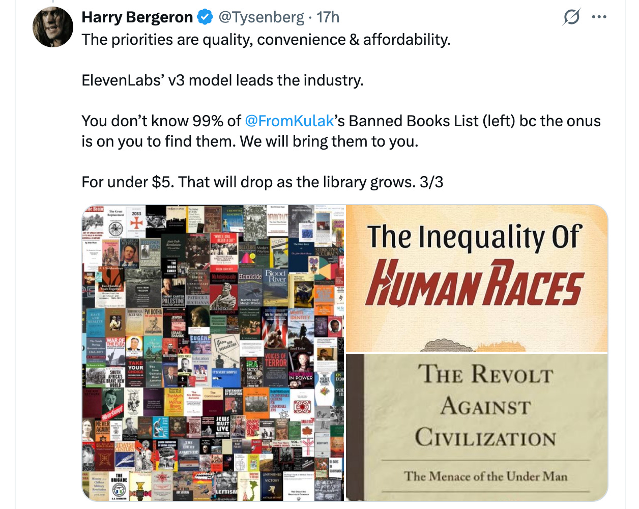 The follow up Tweet suggests they’ll be trying to get actual banned books to be read. All in favor of that of course but it doesn’t fundamentally change the difficulty of access. The difficulty of access is one thing but actually reading it is another. Personally I think reading lists are a bit silly. You should pursue topics that interest you and sometimes lists are a great way to find that but part of the joy of being in a physical second hand book store is finding historical gems that never make it onto edgy reading lists. I guarantee you at least 20% of the banned books reading list is some variation of Jews Bad/Holocaust Denial. How many of those do you exactly need to listen to? As an aside a fair few on Kulak’s list are more practical minded tactics ones that you’d struggle to find useful if just available as audio. The need to underline, or share passages or revisit sections in practical books that teach you something is impossible to replace if you are listening to it. Same for any book with charts or diagrams or pictures.