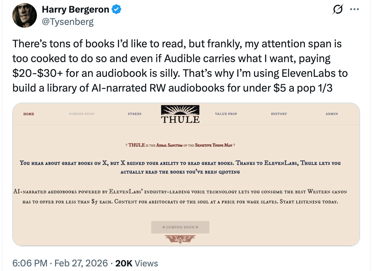 It is trivial to make the obvious critique here but I’ll do it anyway. If your attention span is too cooked to read the books what makes you think you’ll do better listening to them?